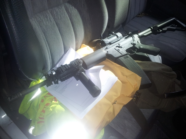 The patrol along with the off duty officer searched the vehicle and found a high power automatic rifle on the passengers seat of the pick-up.