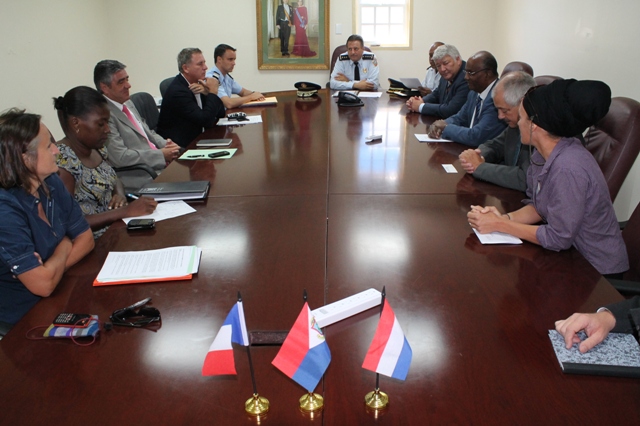 The focus of the discussion was Law Enforcement cooperation between Saint-Martin and Sint Maarten. Préfet Leclair has been sent on a special mission on behalf of the French Minister of Interior Affairs and the French Minister of Justice. The French government is extremely concerned about the rising crime rates in Guadeloupe, Martinique and Saint-Martin and asked Mr. Leclair to write a report on this very pressing issue. Préfet Leclair has a background in law enforcement and was amongst other things Deputy Director of Europol in The Hague.