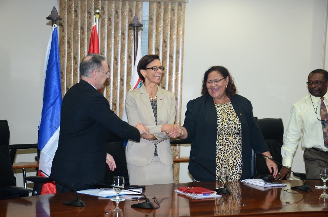 The Prime Minister of St. Maarten the Honorable Sarah Wescot-Williams together with the Prefet of St. Martin and St. Barths Philippe Chopin and the President of the Collectivite of St. Maarten Mrs. Aline Hanson signed the Letter of Intent (LoI) for cross border cooperation between both sides of the island at a signing ceremony on Monday.