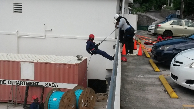 Fire fighters of the Caribbean Netherlands Fire Department are on Saba attending two weeks training in rappelling from high elevations and learning various rope techniques. Three fire fighters from Bonaire two from Saba and St Eustatius each are undergoing the two week long intensive training. Firefighters attending this training are required to train their colleagues in the newly acquired skills and use of the new equipment.