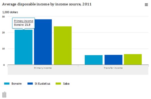 For the first time, Statistics Netherlands has surveyed incomes in the Caribbean Netherlands. In 2011, the average disposable household income on Bonaire was more than 19 thousand dollars, on Saba nearly 21 thousand dollars and on St Eustatius 24 thousand dollars. The income differences on the islands are consistent with the differences in the gross domestic product for the Caribbean Netherlands. Statistics Netherlands announced today that the incomes of the quarter of households in the lowest income bracket on Bonaire, Saba and St Eustatius was approximately 6 thousand dollars.