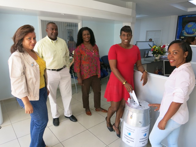 The St. Maarten Chamber of Commerce & Industry (COCI) on March 20th, 2015 launched a Complaints and Suggestions box in the presence of Board of Directors President, Peggy Ann Brandon, management and staff.