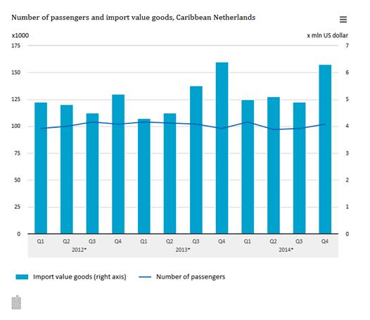 The number of passengers travelling from and to the Caribbean Netherlands increased by more than 4 percent in the fourth quarter of 2014. This increase in the fourth quarter was insufficient to end the year 2014 positive. The increase in passengers in the fourth quarter was attributable to the airports of Bonaire and Saba. On St. Eustatius the number of passengers remained unchanged. The value of goods imported by air was 6.3 million US dollars in the fourth quarter. Compared to a year earlier imports remained stable. However, over the whole of 2014 there was an increase of nearly 4 percent. Various manufactured goods mainly went to Bonaire, which accounts for 90 percent of the total import value by plane.
