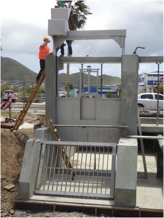 Ministry of Public Housing, Environment, Spatial Development and Infrastructure (Ministry VROMI), Project Manager, Raymond Chittick supervised the installation of the first two floodgates yesterday by Windward Roads and HCW, which is the firm that designed and developed the floodgates in the Netherlands.
