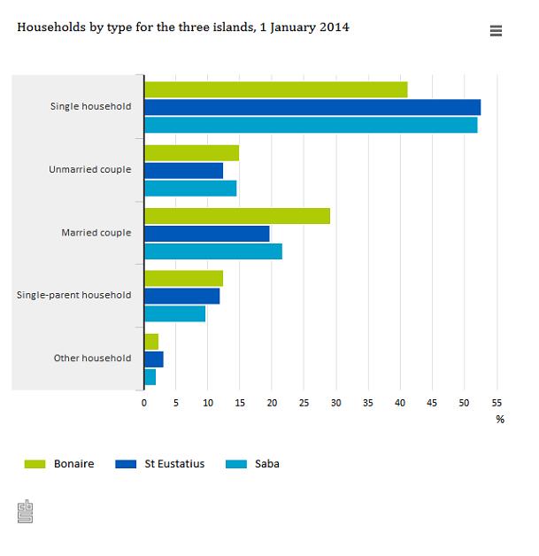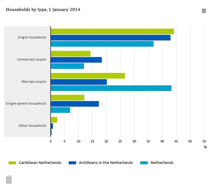 The 24.3 thousand inhabitants of the Caribbean Netherlands lived in nearly 11 thousand households on 1 January 2014. Singles account for 44 percent of these households, single-parent households for 12 percent ,and married couples (with or without children) for 26 percent. In the Netherlands there are relatively more married couples, and fewer single and single-parent households. For Antillean households in the Netherlands the distribution across these categories is more similar to that in the Caribbean than to the average in the Netherlands.