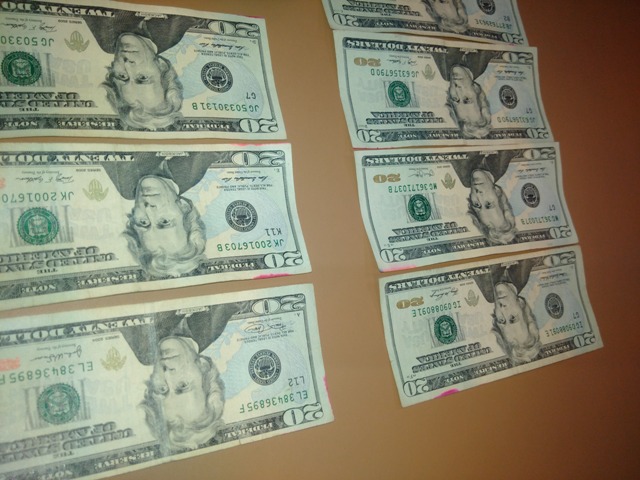 The first sample (A) shows bills which are marked with a small red mark in the corner of the bill, while the second sample is a dye-stained bill. In the case of the first sample, these bills with the small red mark in the corner are good bills and will be accepted and honored by all banks on the island. The second sample (B) of dye stained bills will not be honored by the Banks.