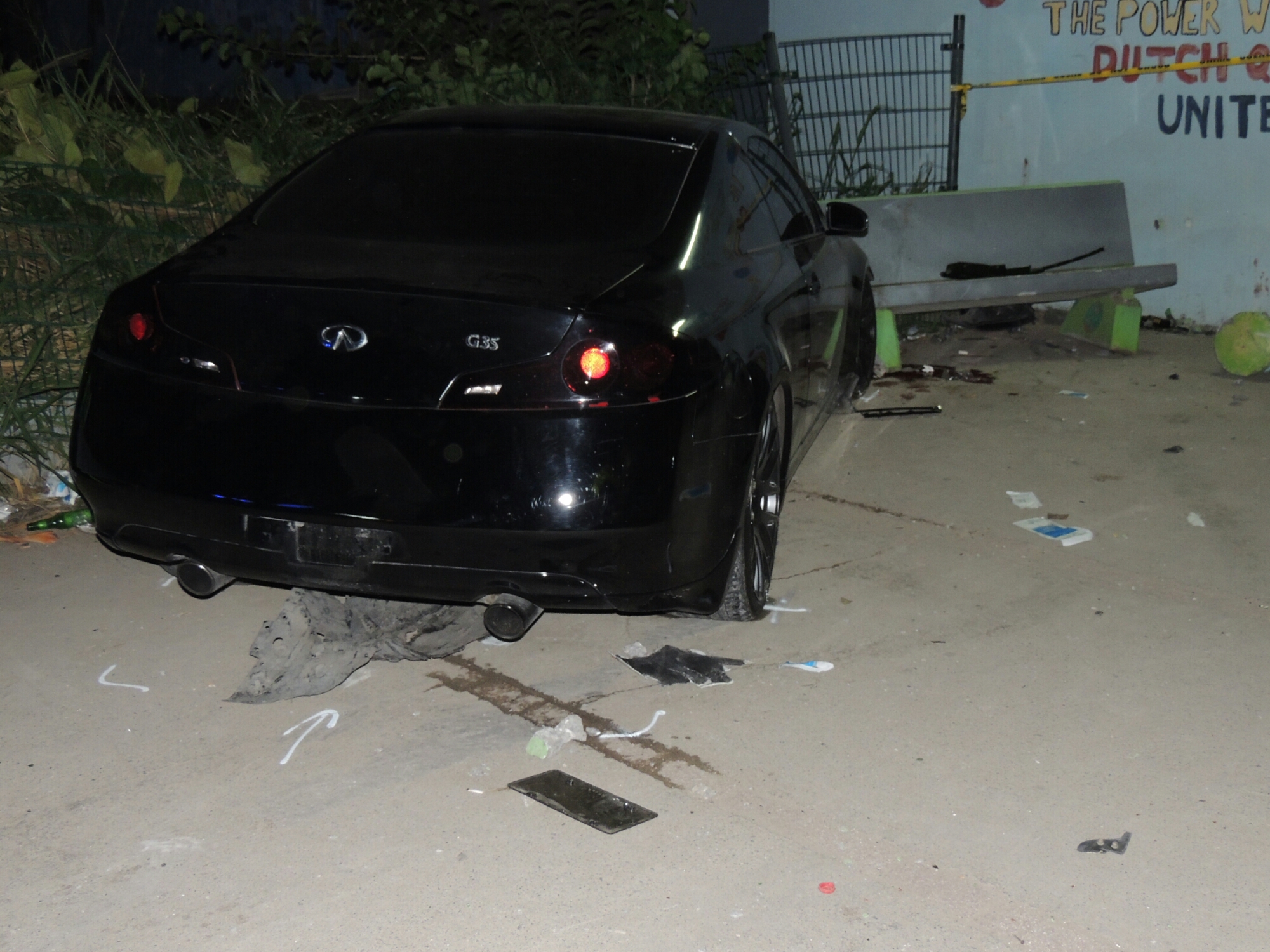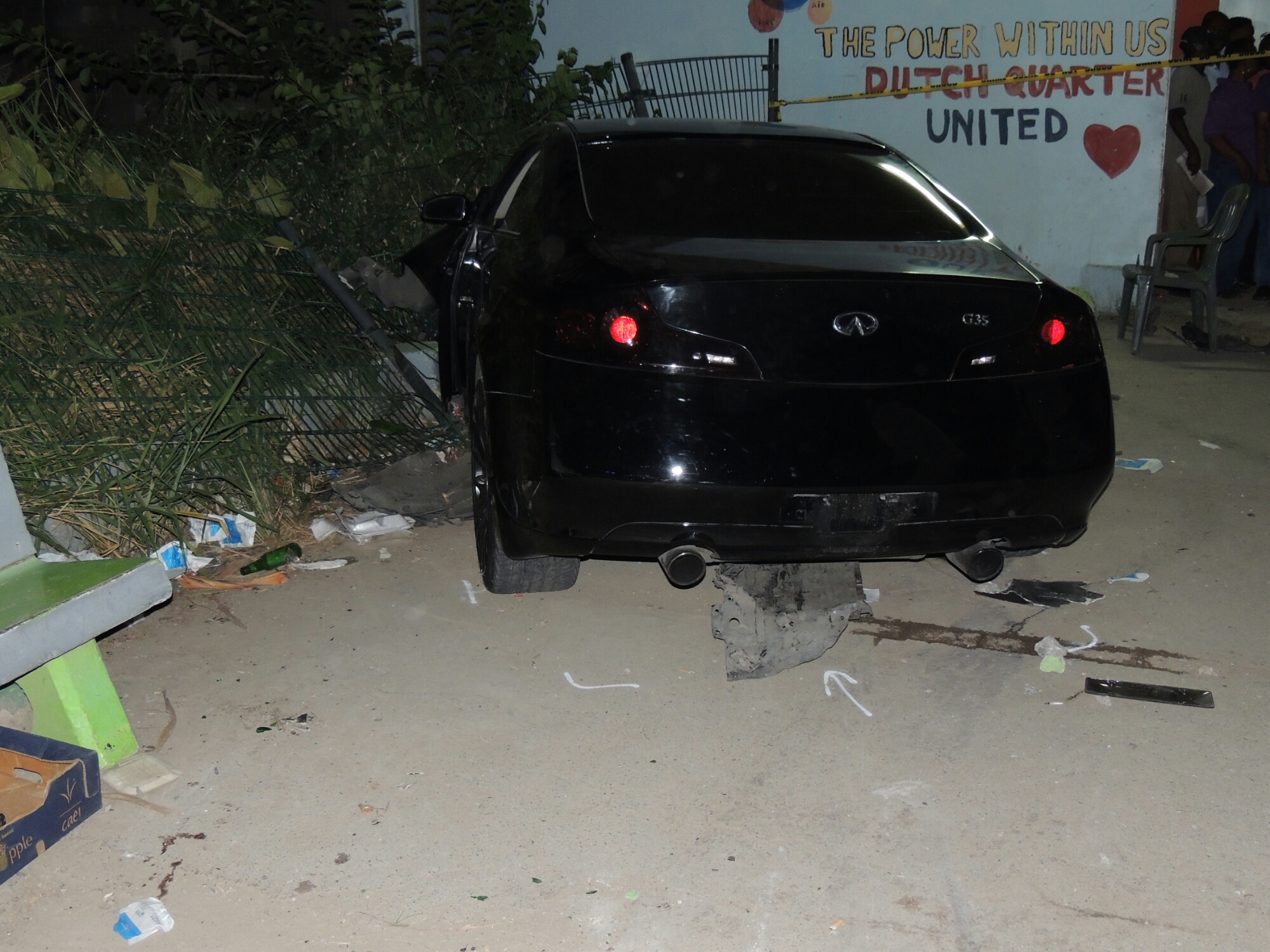 While overtaking the bus, the driver of the car with the initials K.A.M. (23) for still unknown reasons lost control of the vehicle. The vehicle struck a concrete barricade on the side of the road and then collided into a concrete bench where three men were sitting. Two of these men were seriously injured. These men suffered serious injuries to their ankles while one man was treated on the scene and needed no further medical attention. One of the victims was taken, on his request, to the French Side while the other remains in the Sint Maarten Medical center for further treatment.