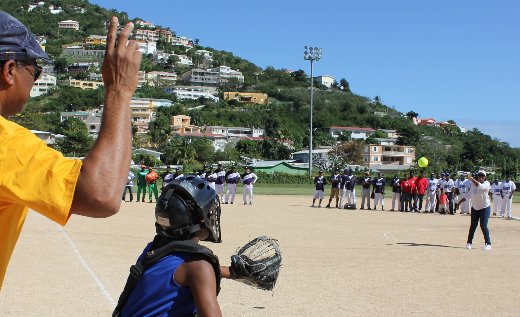 MARY’s FANCY –  Minister of Sports Silveria Jacobs threw out the symbolic 1st pitch and addressed softball fans with words of inspiration at the official opening of the 2016 St. Maarten Pro Softball Association Male & Female Competition.