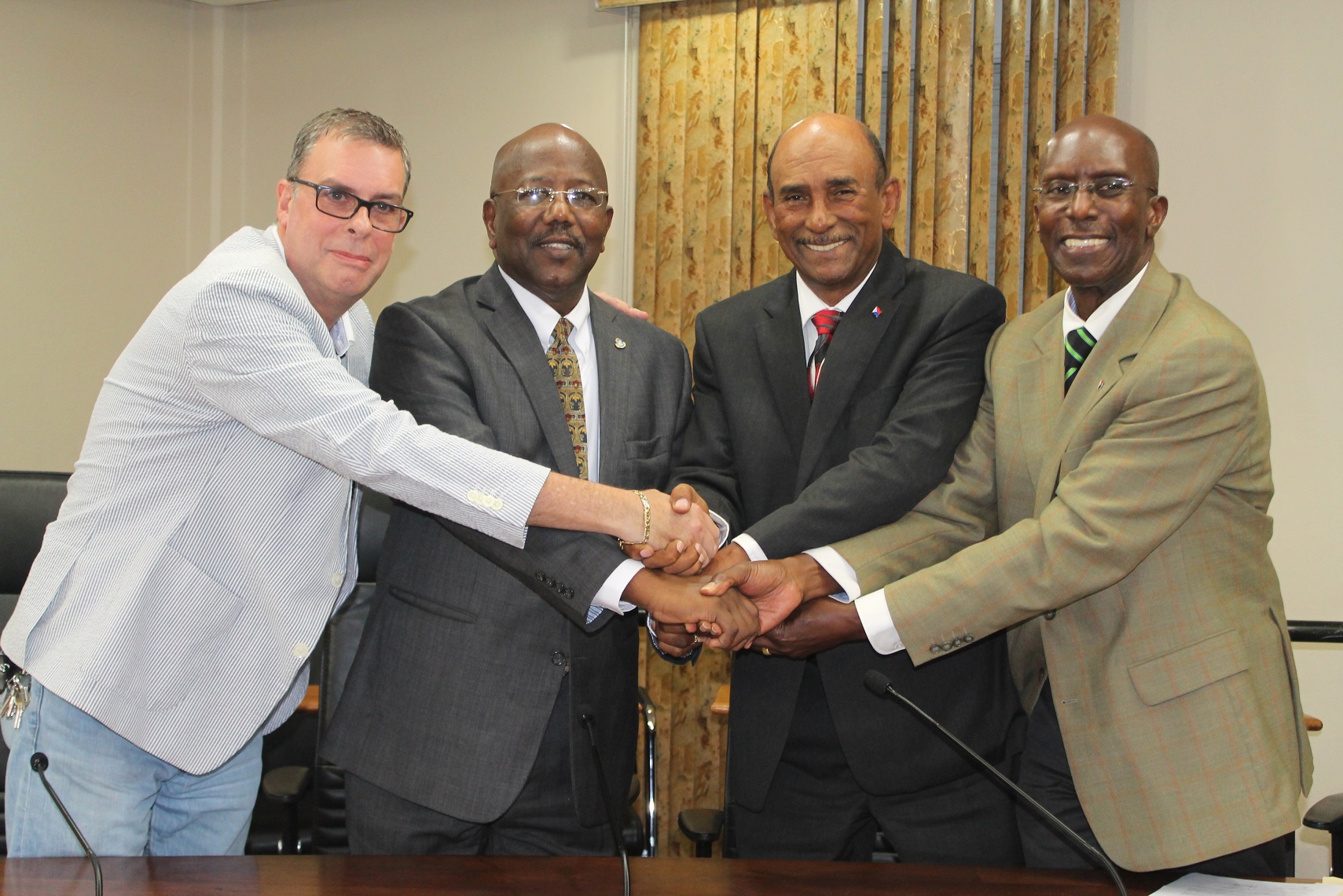 L to R:  Chairman of USZV – Mr. Glen Carty Prime Minister William Marlin Minister of Finance Richard Gibson Chairman of APS – Mr. Franklyn RichardsSigning Ceremony Sale & Purchase Agreement of the New Government Building (SZV, APS, & Government of Sint Maarten)
