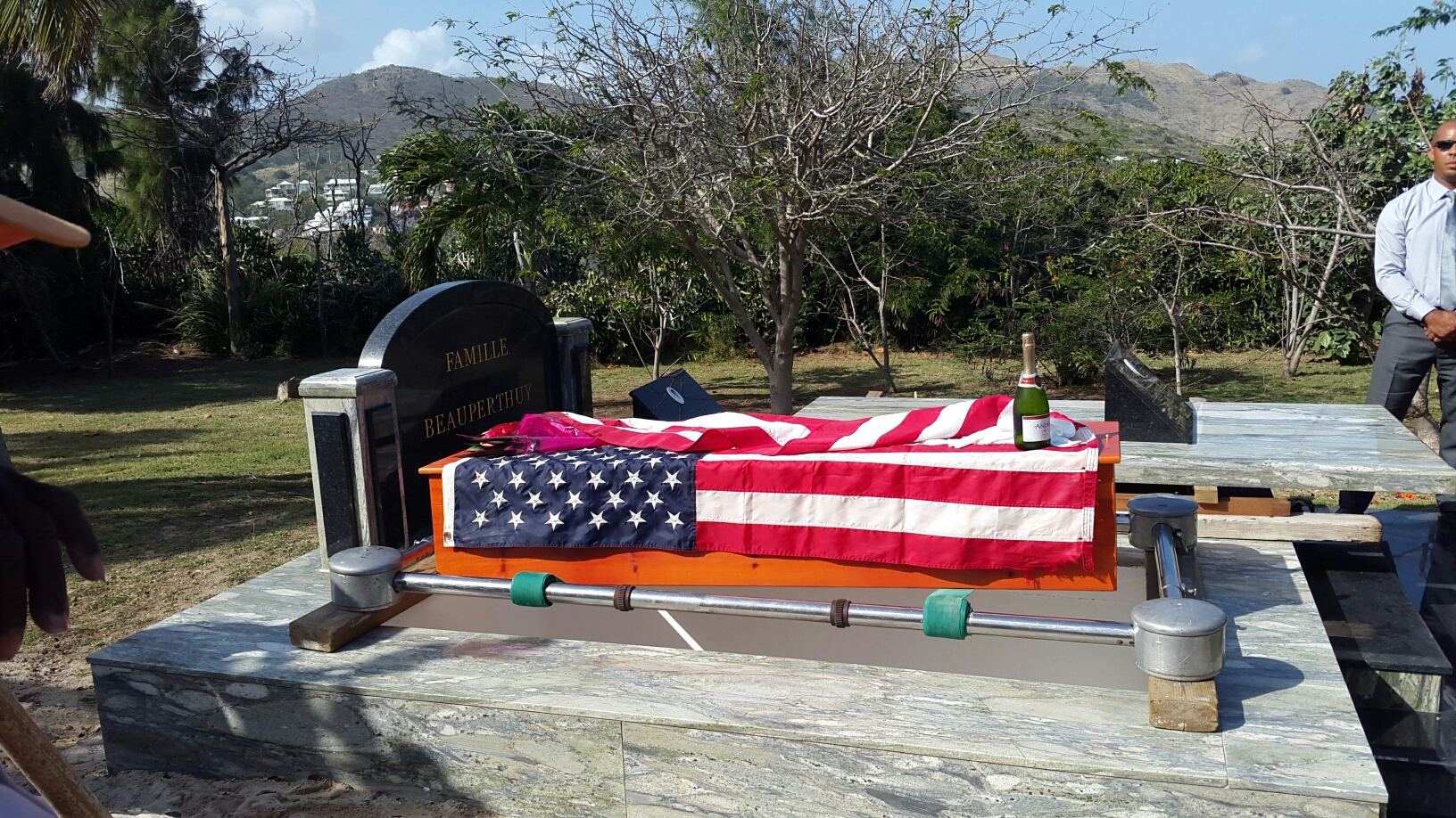 At his final resting place, the U.S. Government, represented by Sergeant Muriel Smith, presented to his daughter Bonny Louise Linares-Beauperthuy and visiting brother from Aruba Valentin Arrindell, an American Flag along with words of gratitude for his service to country. Titus, caretaker of Captain Louis, on Saturday toasted a bottle of ‘Andre Champagne’ over his tomb along with a goodbye salute in the presence of family and close friends.