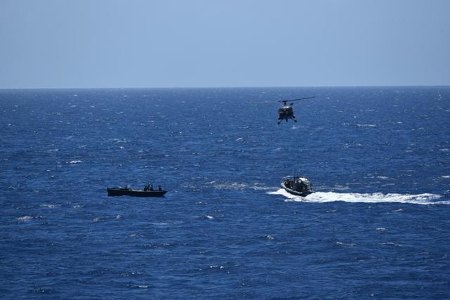 Upon arrival of the frigate, the crew of the go-fast surrendered. The packages that were thrown overboard, were taken out of the water by the crew of HNLMS De Zeven Provincien. A combination of marihuana, hash and MDMA (to make XTC) was found in them. The US Law Enforcement Detachment that is embarked on the Dutch warship, took the suspect crew into custody.
