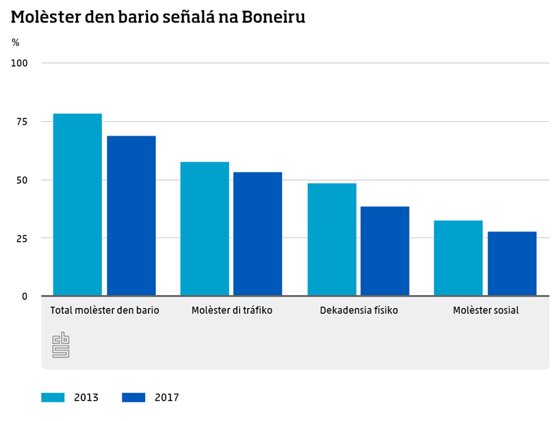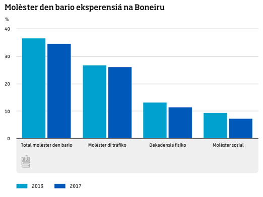 E kantidat di siudadanonan di Boneiru ku den 2017 a raportá molèster den nan bario ta mas abou ku den 2013. Na 2013 kasi 80 porshento a duna di konosé ku molèster den besindario tabata un problema masha komun. A indiká den 2017 mes tantu bia molèster di tráfiko. Dekadensia físiko i molèster sosial a wòrdu raportá ménos frekuente.