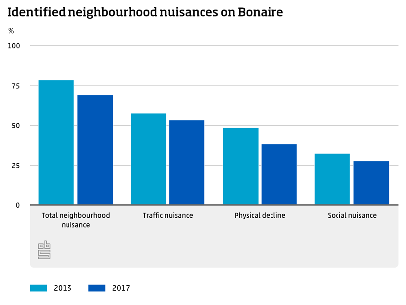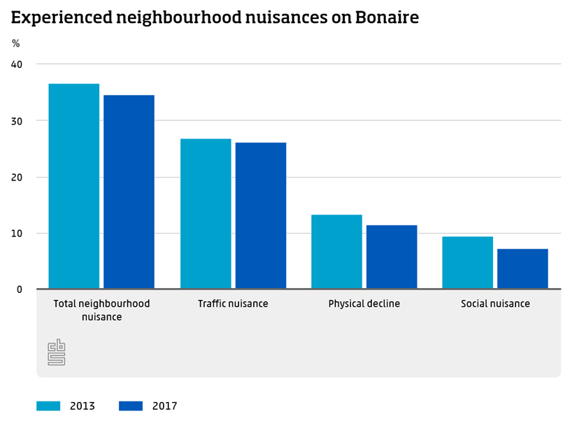 In 2017, the number of Bonaire residents who reported neighbourhood nuisances was lower than in 2013, when nearly 80 percent indicated these nuisances were a common problem. Traffic nuisances occurred equally often in 2017, while physical decline and social nuisances occurred less often than four years previously.
