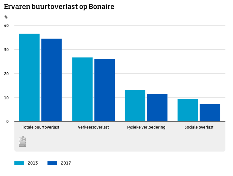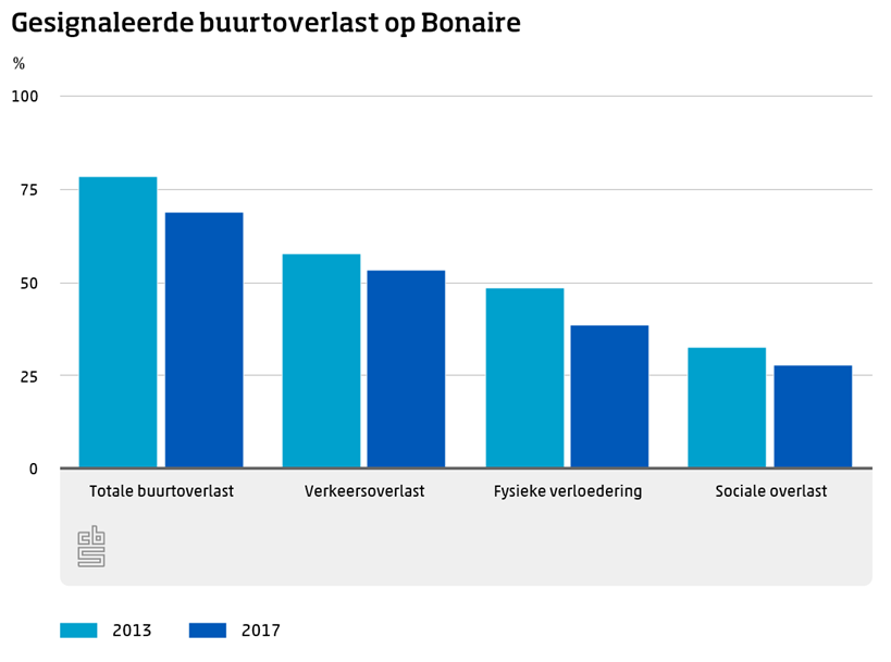 Het aantal burgers van Bonaire die in 2017 overlast in hun woonbuurt rapporteerden is lager dan in 2013. Toen gaf bijna 80 procent aan dat buurtoverlast een veel voorkomend probleem was. Verkeersoverlast werd in 2017 even vaak gesignaleerd, fysieke verloedering en sociale overlast minder vaak dan vier jaar eerder.