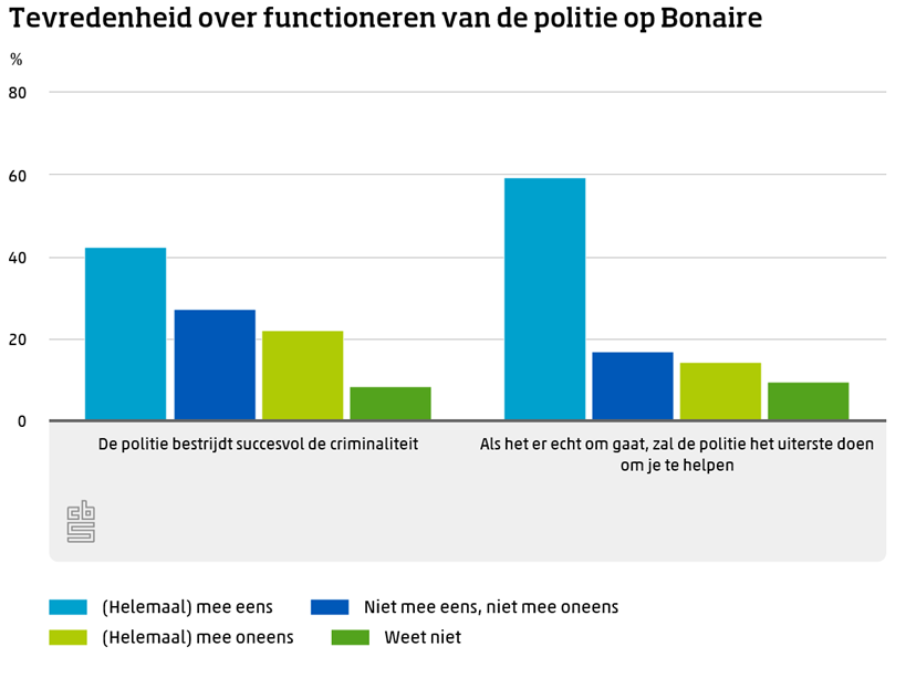 Bijna 60 procent was het eens met de stelling dat de politie op Bonaire het uiterste zal doen om je te helpen, als het er echt om gaat. 14 procent was het hier niet mee eens.