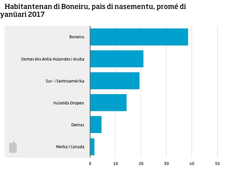 Kasi 40 porshento di e habitantenan di Boneiru a nase riba e isla. E sobrá 60 porshento ta partikularmente prosedente di èks Antia Hulandes (4 mil), Sur- i Sentroamérika (3,7 mil) i Hulanda Oropeo (2,8 mil). Pa loke ta trata demas èks Antia Hulandes ta trata partikularmente di habitantenan ku a nase na Kòrsou (3,5 mil), un kantidat chikitu ta prosedente di Aruba (0,5 mil).Konsiderando fasilidatnan médiko na Boneiru te ku añanan 90, hopi hende muhé na estado tabata haña yu na Kòrsou, loke por ta un indikashon di e kantidat di habitante di Boneiru nasé na e hermana isla aki (18%).
