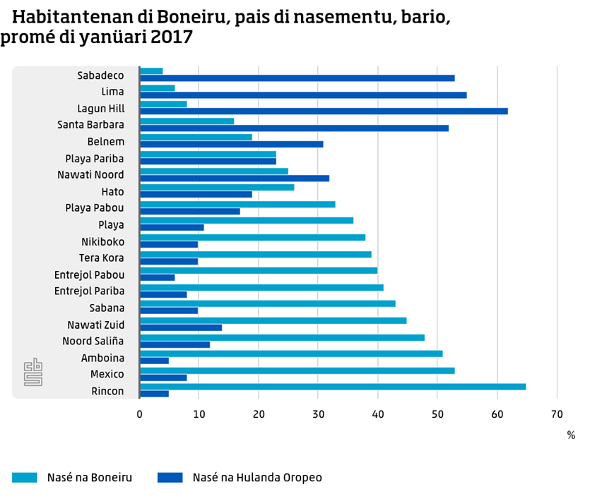 Rincon ta e bario ku tin mas tantu habitante boneriano (65 porshento). Den Mexico (53 porshento), Amboina (51 porshento) i Nort Saliña (48 porshento) tambe tin hopi boneriano ta biba. Na Lagun Hill, Lima i Sabadeco ta biba solamente un kantidat chikitu di personanan ku a nase na Boneiru.